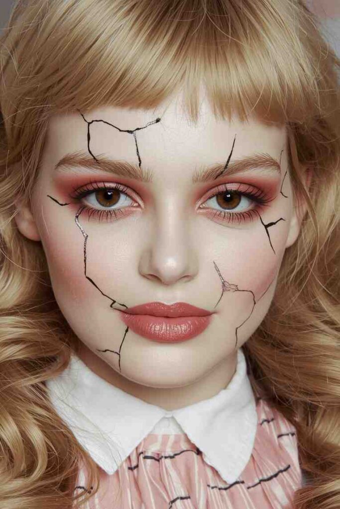 Draw thin crack lines across your face using eyeliner, focusing on the cheeks or forehead. Blend soft pink shadow around your eyes and cheeks for a doll-like flush. The effect is creepy yet charming — a perfect Halloween classic.