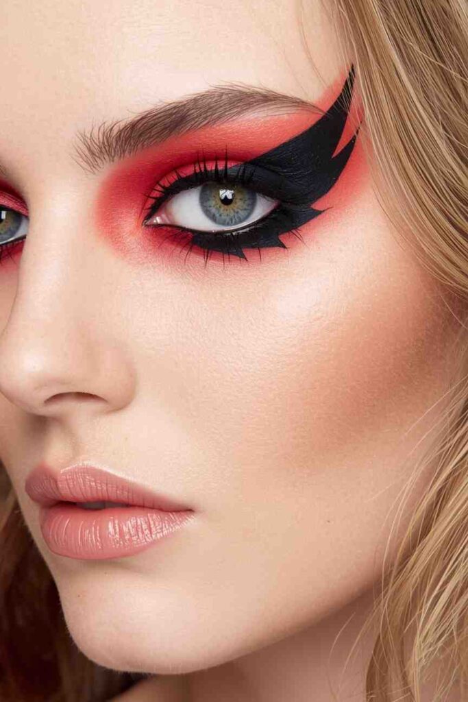 Go dramatic with an elongated, smokey cat eye using black and gray shadows. Extend your liner past the outer corners for a feline flick, and smudge dark shadow underneath. It’s sleek, seductive, and perfect for anyone who wants a bold Halloween vibe without going overboard.