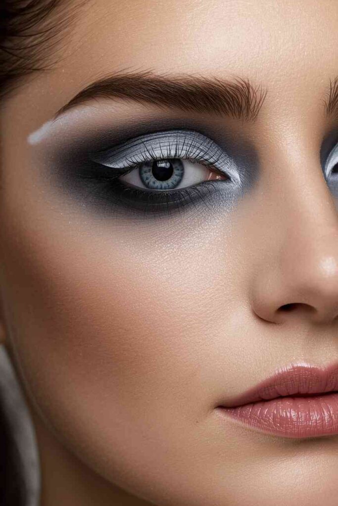 Blend soft grays and blacks into a gradient smoke around your eyes. Use white eyeliner on the waterline to brighten the eyes and give a ghostly glow. It’s classic, eerie, and beautiful — ideal for a haunted spirit vibe.