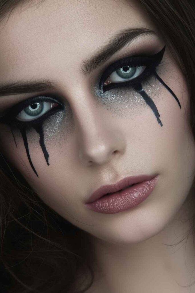 Draw small teardrops under your lower lashes with eyeliner, then blend a deep plum or gray eyeshadow around the eyes. It’s elegant yet haunting — a perfect mix of gothic beauty and Halloween mystery that works for any dark, romantic outfit.