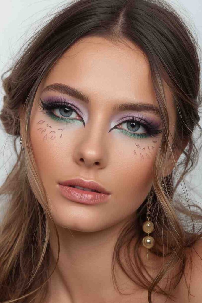 Blend purple, green, and blue shadows across your lids and temples for a soft, enchanted vibe. Outline delicate swirls or leaves with eyeliner for fairy-like magic. It’s whimsical, feminine, and easy to do — perfect for beginners who want a fantasy look.
