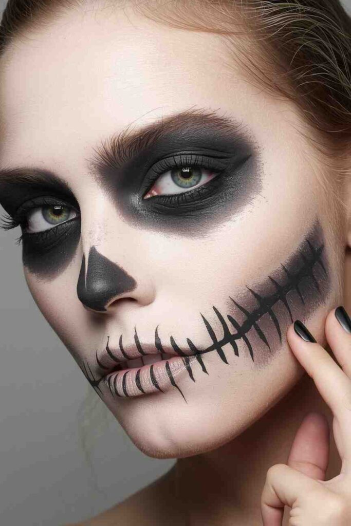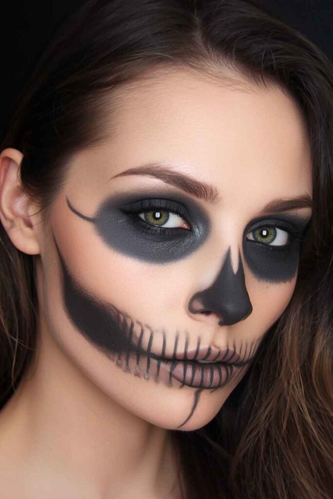 With only eyeliner, you can sketch out hollow sockets and cracks around your eyes. Use black and gray shadows to contour the hollow areas for a sunken effect. This minimal skeletal design delivers maximum eeriness — no face paint required.