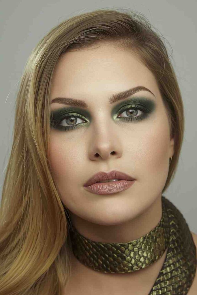 Create a reptilian illusion using green and black shadows blended in a scale-like pattern. Use eyeliner to draw sharp snake-like edges at the corners of your eyes. This slithery, seductive look adds an exotic twist to any costume.