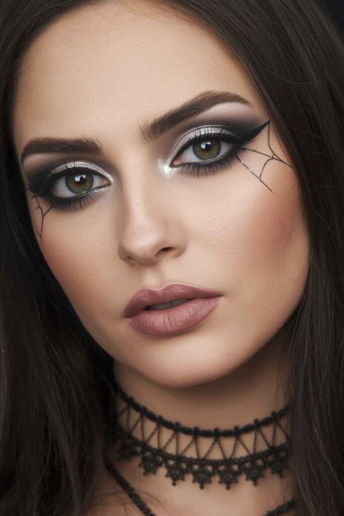 Draw delicate webs from the outer corners of your eyes using a fine-tip black eyeliner. Add silver or gray eyeshadow to create depth and shimmer. This look is striking yet easy to achieve and pairs beautifully with any gothic or witch costume.