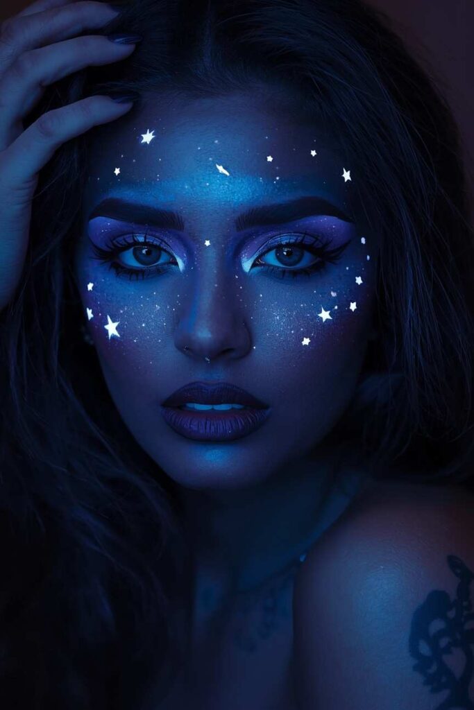 Blend dark blue, purple, and black shadows to create a galactic base. Use white eyeliner to draw stars and constellations across your temples or cheeks. This dreamy design glows under low light and gives you that mystical, celestial charm perfect for Halloween night.
