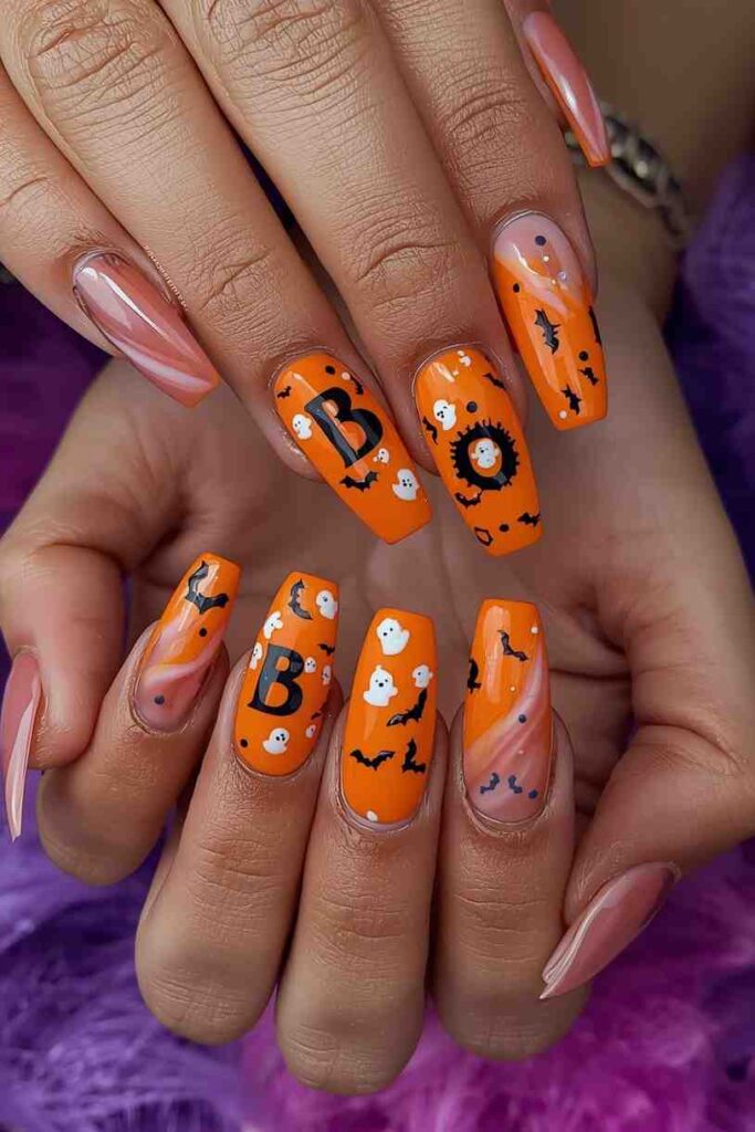 Spell out “BOO” across your nails in bold, playful lettering. Use orange, black, or white for maximum impact. Add small hearts, dots, or stars around the letters to enhance cuteness. This design allows you to combine words with seasonal motifs for a creative and fun effect. Alternate letters with Halloween icons on other nails to balance the look. “BOO” nails are simple, stylish, and perfectly playful, capturing Halloween spirit in a cheerful, graphic style.