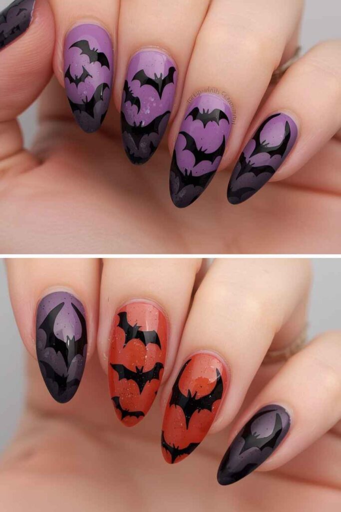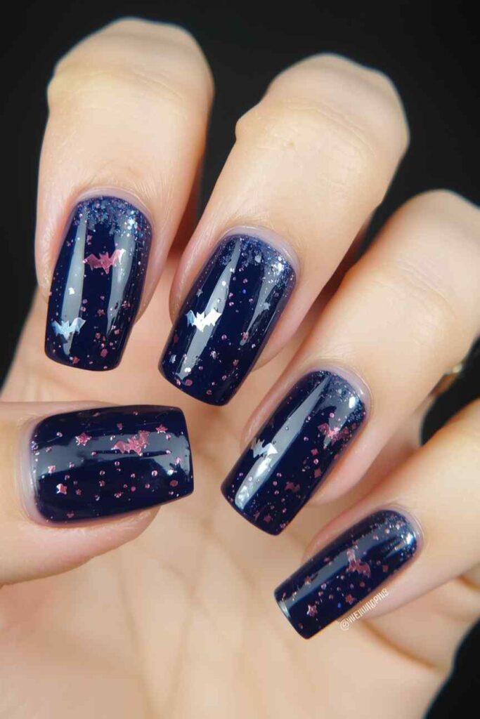 Paint a dark blue or purple base and scatter tiny bats among twinkling stars. The dreamy design is playful yet magical. Starry night bats are elegant, whimsical, and festive, adding Halloween charm without being scary. This manicure works beautifully with glitter or metallic accents for extra sparkle.