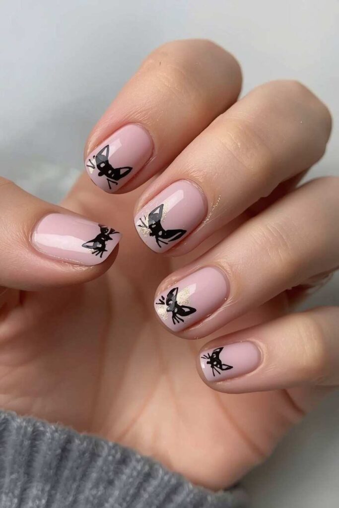Paint tiny black cat faces, ears, or whiskers on pastel or neutral nails. Add gold or silver details for subtle sparkle. This playful design nods to Halloween tradition but keeps a cute and stylish edge. Ideal for cat lovers or those who want fun-themed nails that aren’t scary. The contrast of black shapes against soft backgrounds creates a whimsical yet elegant manicure, making it both charming and seasonally appropriate.