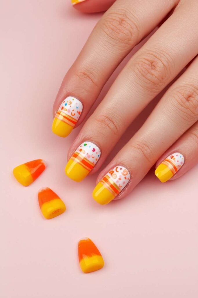 Bring sweet nostalgia to your nails with candy corn-inspired stripes. Use white, orange, and yellow to mimic the classic treat. Finish with a glossy top coat or subtle glitter for shine. These nails are bright, cheerful, and fun for anyone who loves a playful Halloween style. Candy corn nails are ideal for short or long nails, and the colors pair beautifully with fall outfits. This design perfectly blends festive spirit with cute and approachable artistry.