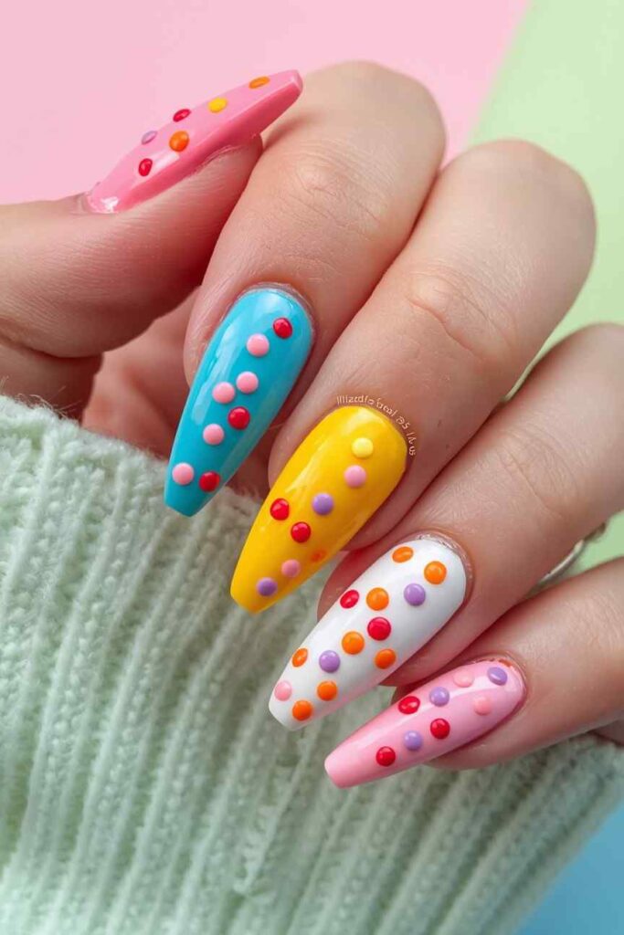 Scatter colorful dots or glitter across a nude or light base to mimic candy sprinkles. This cheerful design is playful and bright, bringing instant joy to your nails. It works on short or long nails and looks especially fun for parties or casual Halloween outings. Candy sprinkle nails are a lighthearted and whimsical manicure, combining festive color with a cute, creative approach. Perfect for anyone wanting cheerful, fun, and eye-catching Halloween nail art without being scary.