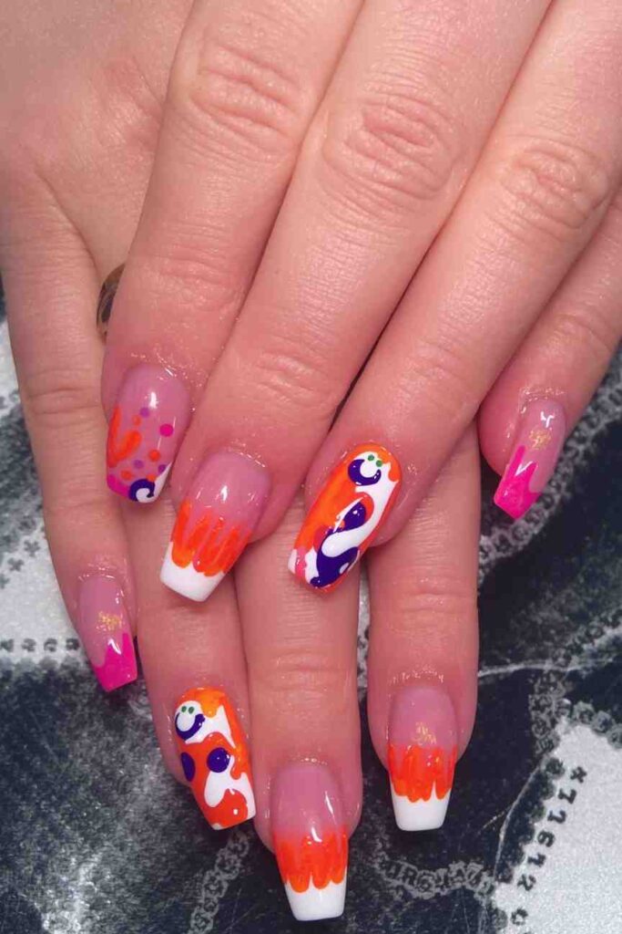 Create a melting candy effect at the nail tips using bright pink, purple, or orange shades. This playful design is both trendy and festive, mimicking dripping Halloween treats. Drippy candy nails are cheerful, vibrant, and fun for parties or casual wear. It’s perfect for anyone who wants a bold yet cute manicure with creative seasonal flair.