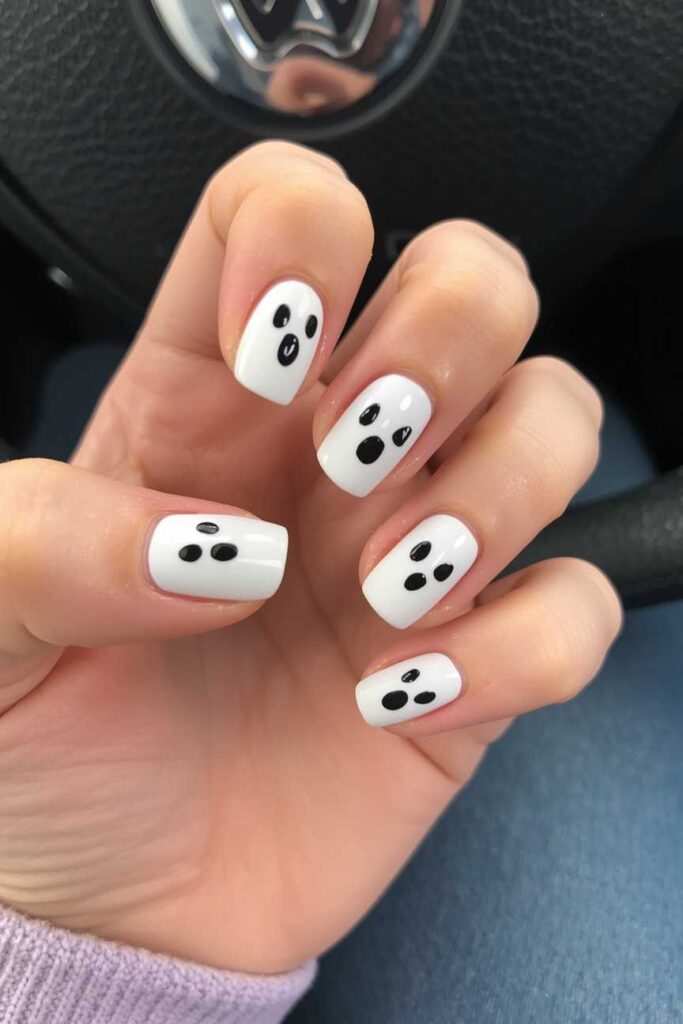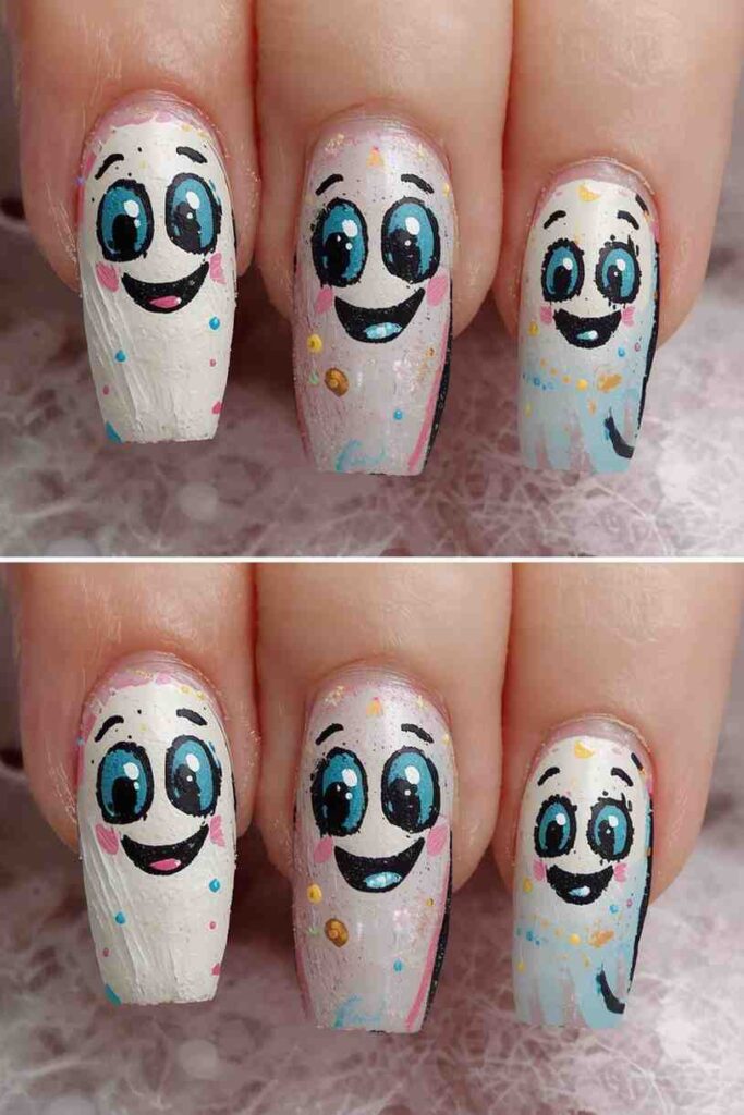 Instead of scary ghouls, paint tiny smiling ghosts on a pastel or nude base. Add small black eyes and cheerful expressions for personality. This playful design keeps Halloween fun and wearable, making it perfect for everyday wear or parties. You can add subtle glitter to the ghosts for a magical sparkle. It’s simple yet creative, ideal for beginners and anyone who wants a cheerful, whimsical manicure that celebrates Halloween without being frightening.