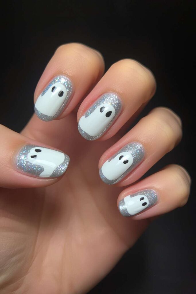 Enhance ghost nails with glitter polish for a sparkling effect. Paint white ghosts on a soft base and top with iridescent or silver glitter. The glitter adds charm and magic, giving a festive, playful twist. Perfect for parties or casual wear, glitter ghost nails combine whimsy and glamour. The design is cute, cheerful, and perfect for those who want their Halloween nails to stand out while staying lighthearted and fun.