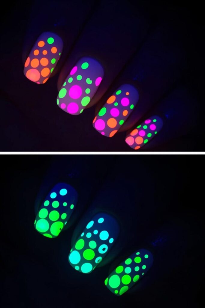 Use glow-in-the-dark polish to create playful dots on a soft base. The nails shine in the dark, adding a fun surprise for Halloween night. This design is simple yet interactive, combining whimsical appeal with practicality. It works for any nail length and adds a cheerful, glowing element to your Halloween look, making your manicure playful, festive, and memorable.