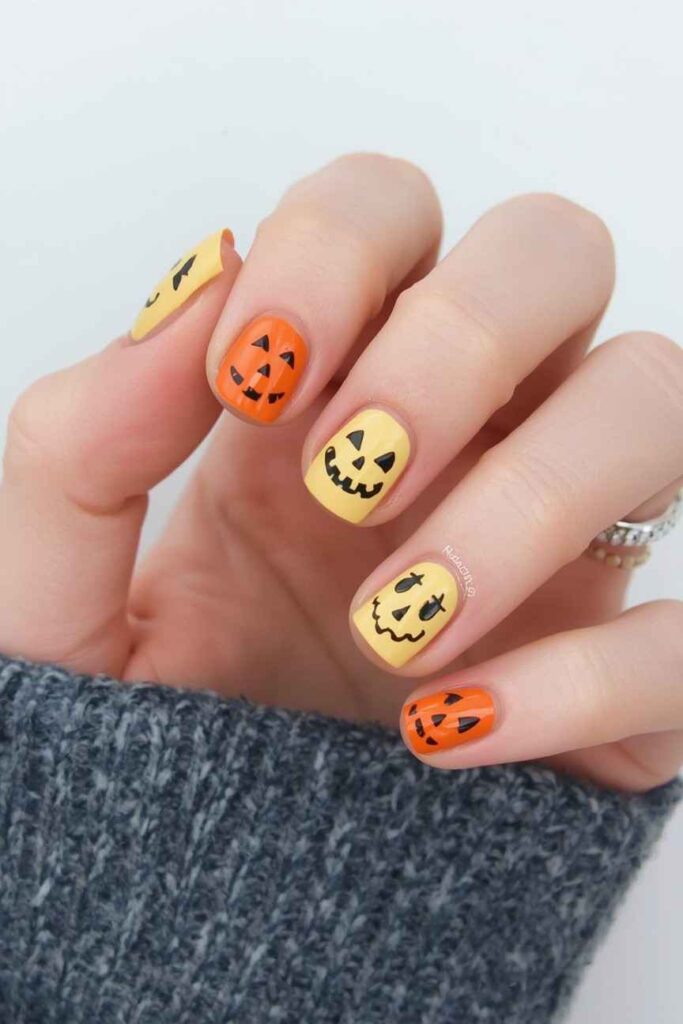 Paint small jack-o’-lantern faces on orange or yellow accent nails. Keep the expressions smiling and friendly for cuteness. This simple yet festive design adds playful Halloween charm to any manicure. Combine with neutral or pastel nails to keep it subtle. Mini pumpkin faces are perfect for those who love classic Halloween motifs but prefer a cheerful, approachable aesthetic that’s both playful and stylish.