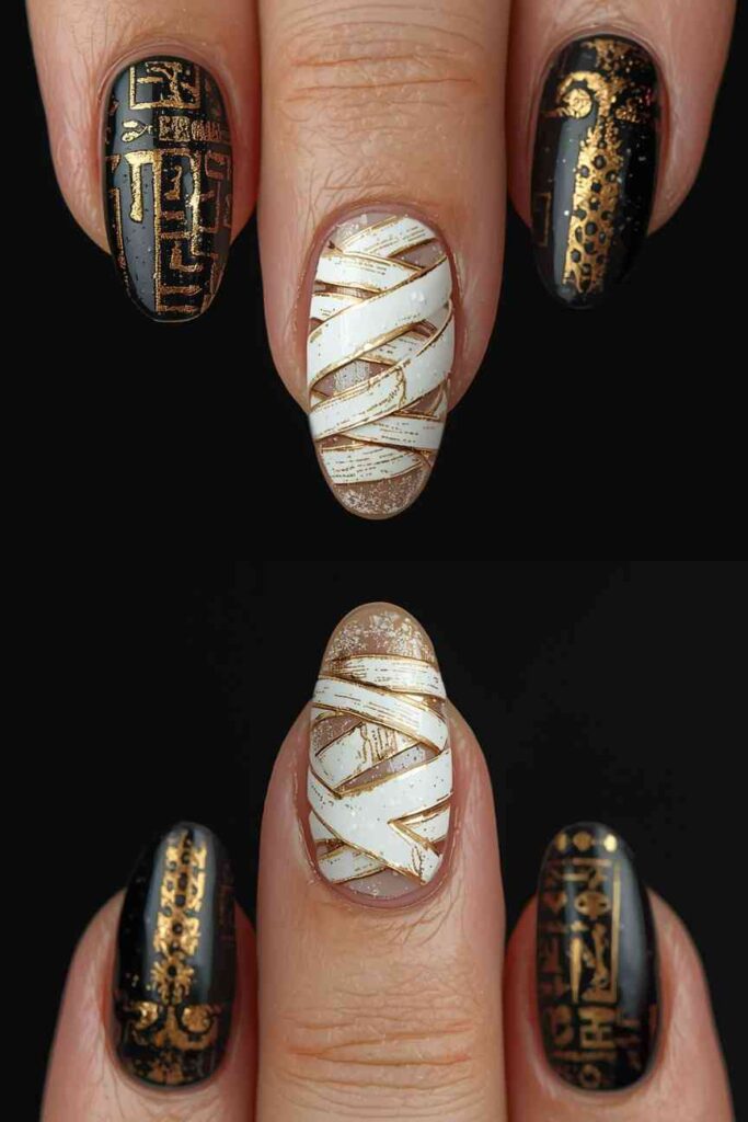 Create a friendly mummy effect with beige nails crisscrossed with thin white lines. Add two tiny black dots on an accent nail for eyes. This quirky design is easy for DIY enthusiasts and works even with imperfect lines. The muted base combined with white detailing creates a subtle, whimsical, and playful manicure. Mummy wrap nails are perfect for those who want cute, themed nail art that’s creative and seasonally festive without leaning too spooky.