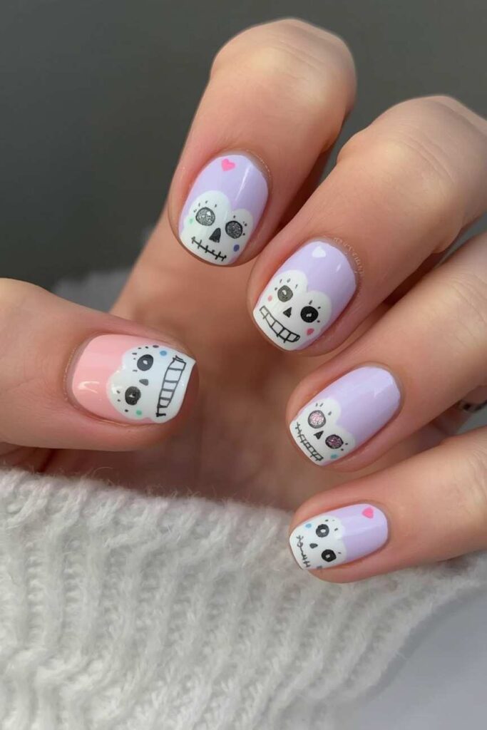 Soft-colored skulls in pink, lavender, or mint bring a whimsical twist to traditional skull designs. Add tiny heart eyes or glitter details to enhance cuteness. Pastel skulls keep your manicure fun and playful while maintaining a Halloween vibe. The design is perfect for those who enjoy themed nails with a charming, non-scary twist.