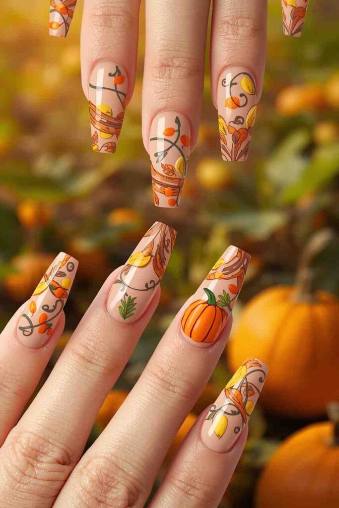 French tips inspired by pumpkin patches are fun and festive. Paint your nail tips bright orange and add tiny pumpkins, vines, or golden leaves on accent nails. This cozy design captures autumn vibes without being too bold. Use fine brushes for leaf details or a little glitter for extra shine. Pumpkin patch nails are perfect for fall outfits, parties, or casual wear, giving a cheerful and seasonal touch to your manicure while keeping it playful and elegant.