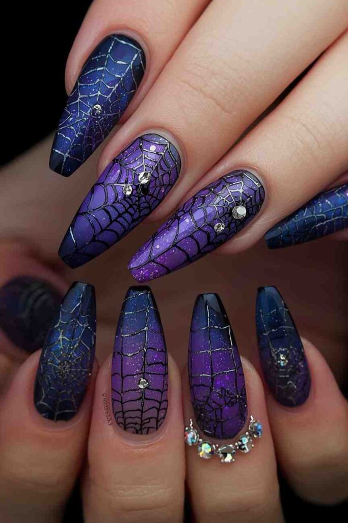Add delicate spider web details to neutral or pastel bases. Draw fine white or silver lines in corners, and place a tiny rhinestone at the center for sparkle. This subtle yet playful design is elegant, perfect for minimalists, and ideal for everyday wear. Spider web accent nails pair beautifully with other soft designs or glitter accents. The intricate pattern adds a whimsical touch while staying lighthearted, festive, and stylish for a cute Halloween-inspired manicure.