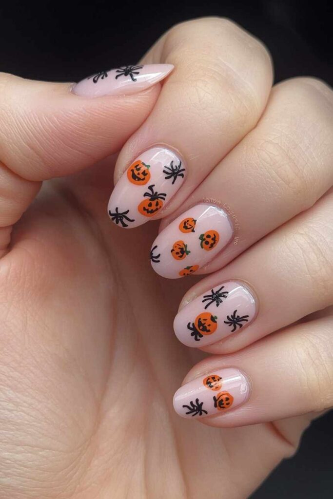 Combine tiny black spiders with cheerful pumpkin faces across accent nails. The mix of motifs creates a playful, coordinated Halloween look. Keep the base colors neutral or pastel for subtle charm. This design is perfect for those who want multiple seasonal elements on their nails while staying cute, creative, and fun.
