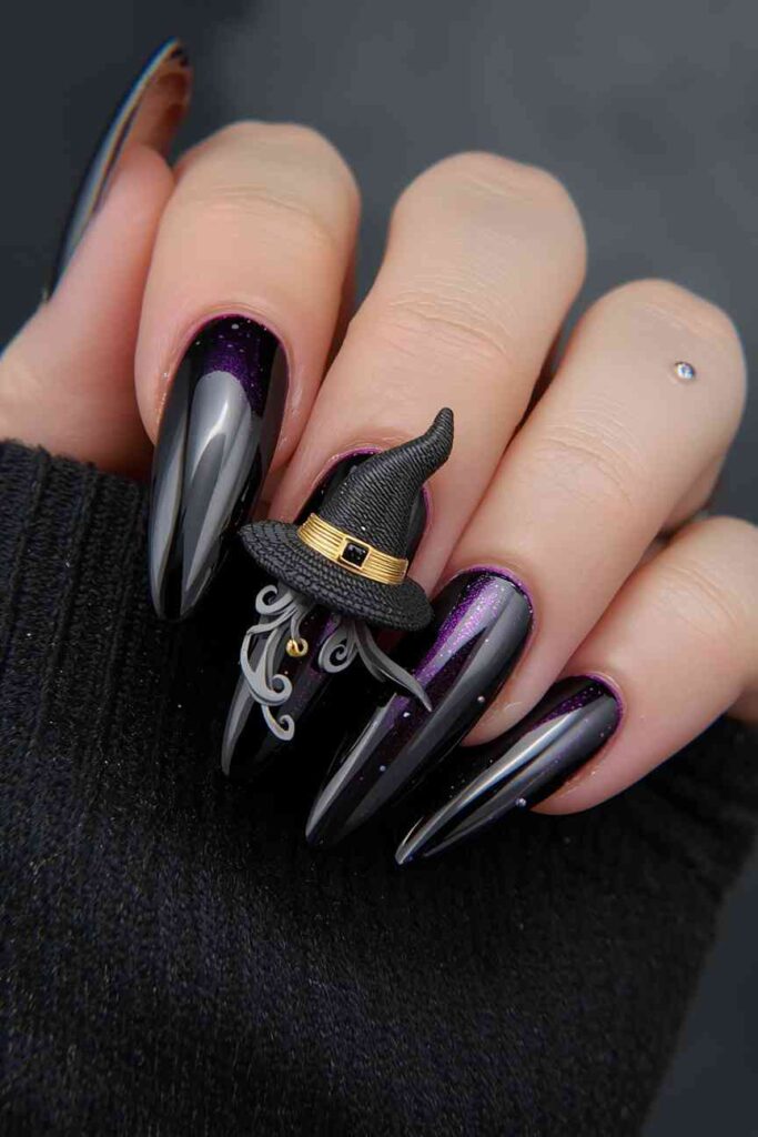 Add tiny witch hats to one or two accent nails on a pastel or nude base. Pair with stars, moons, or sparkles for a magical vibe. This whimsical design balances Halloween charm with elegance. Witch hat nails are perfect for themed parties or subtle Halloween flair. The small details make the nails playful without being overwhelming, adding a touch of creativity and seasonal fun.