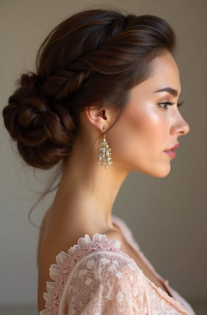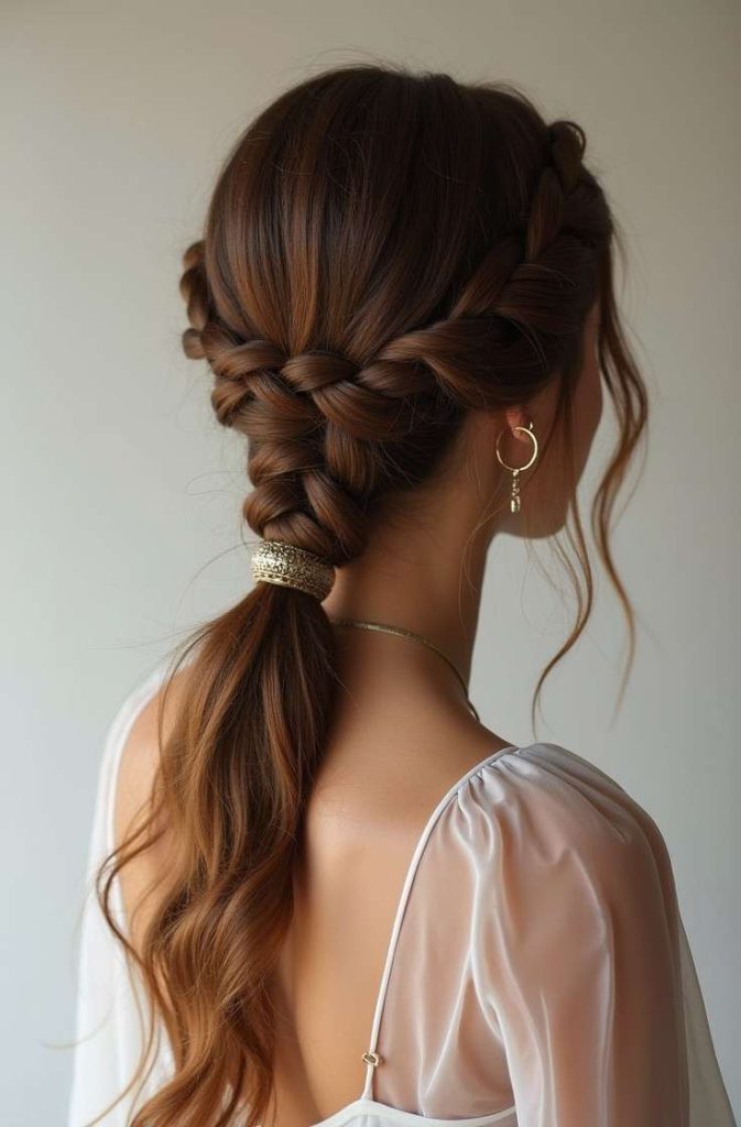 The braided low ponytail combines softness and structure, making it ideal for romantic evenings. The braid adds texture while the low placement keeps the look elegant.