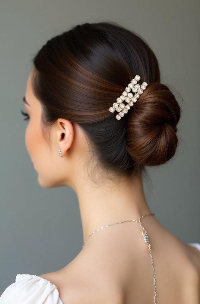 How to style it: Smooth hair upward, secure tightly, and finish with serum for shine.