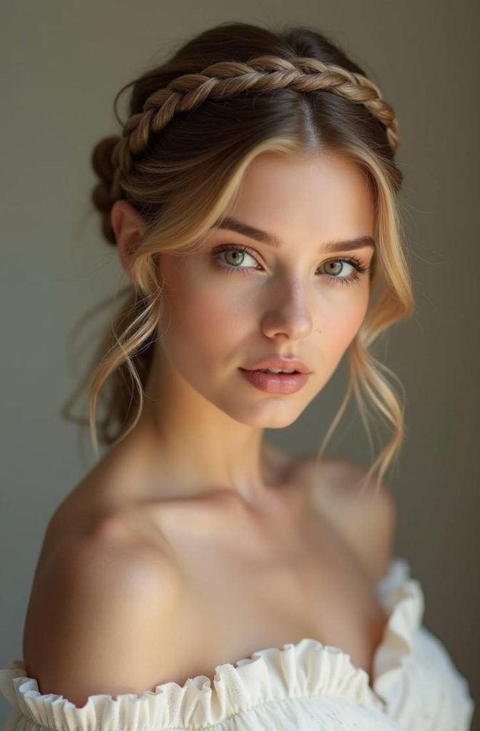 The braids add texture and dimension, making this style flattering for medium to long hair and various hair types. Whether styled neatly or slightly loose, the double braided crown pairs beautifully with flowy dresses, soft makeup, and delicate accessories for a truly romantic look.