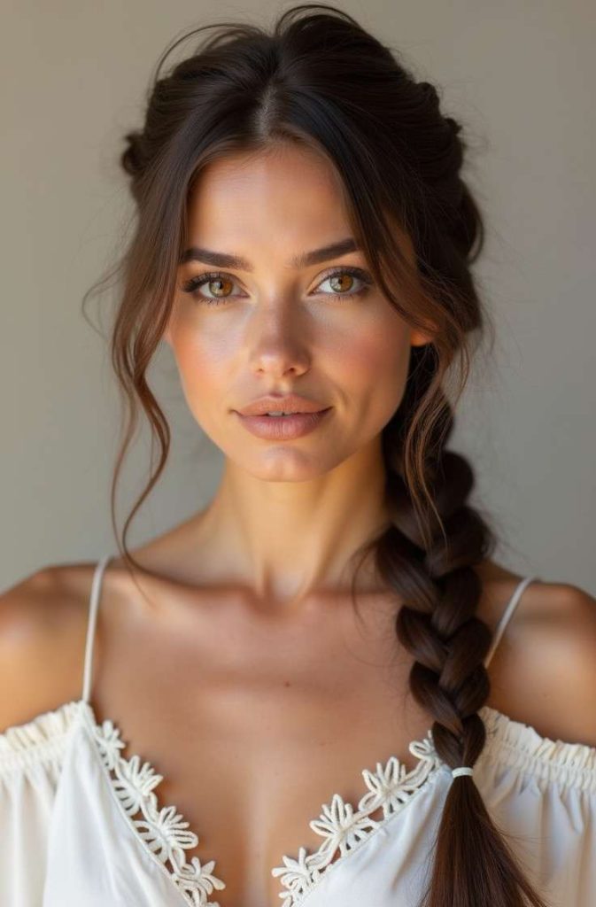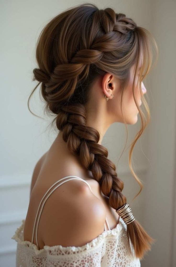 Worn to the side, it creates a soft, feminine silhouette that highlights the face and neckline. This style works especially well for medium to long hair and pairs beautifully with both casual and dressy outfits. The fishtail side braid brings a relaxed yet polished feel that feels thoughtful, romantic, and timeless.