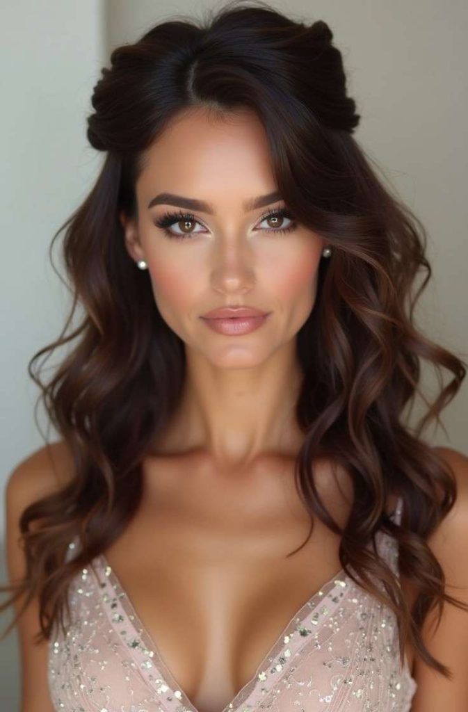 This hairstyle is perfect for Valentine’s Day dinners, special celebrations, or any date night where you want to look elegant yet approachable. It beautifully highlights the neckline and shoulders, making it an excellent choice for dresses with delicate straps or off-shoulder designs while maintaining a soft, romantic vibe.