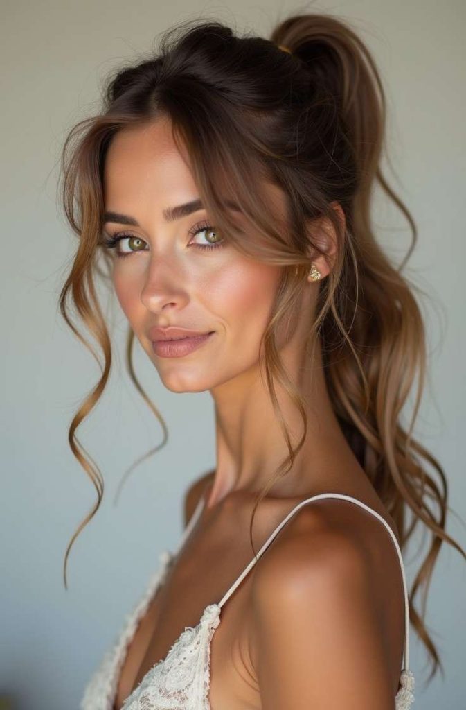 A loose ponytail with face-framing layers is a soft, flattering hairstyle that enhances your natural features while keeping things effortless. The loose structure prevents the ponytail from feeling tight or severe, while the front layers gently frame the face, adding softness and balance.