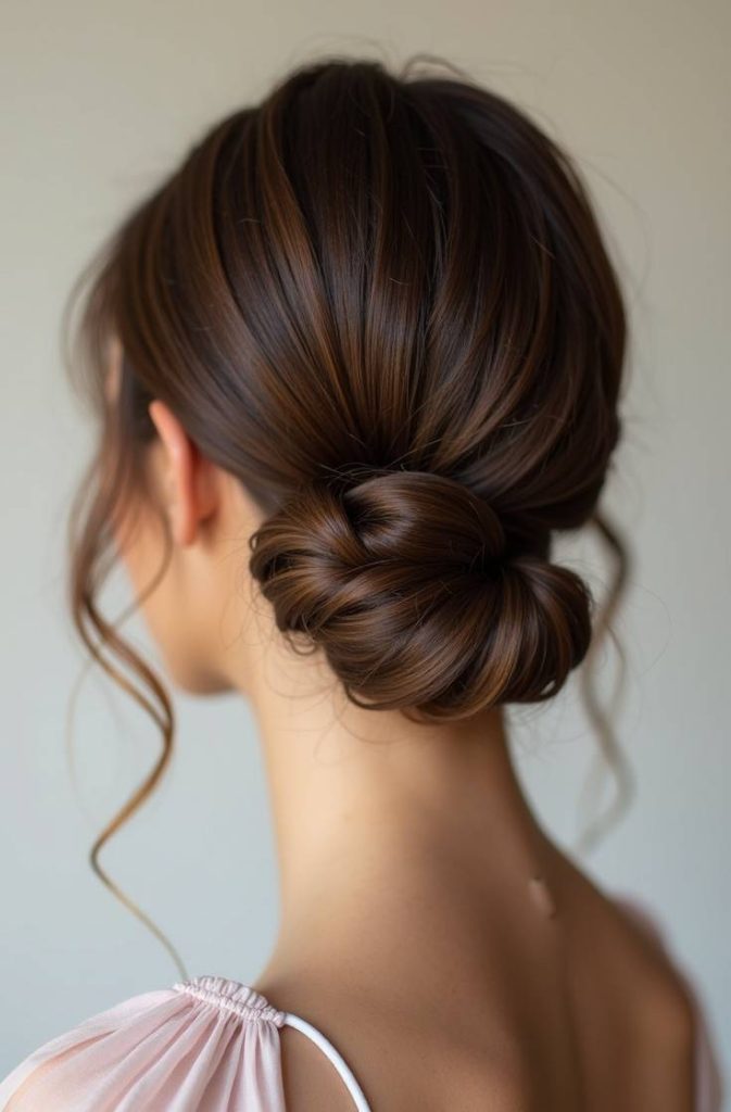 How to style it: Gather hair at the nape, twist into a loose bun, and secure with pins. Pull out face-framing strands.