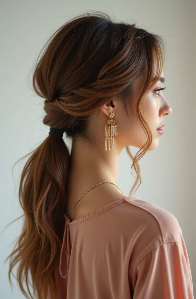 It works beautifully with wavy or lightly curled hair and flatters almost every face shape. Whether paired with a cozy outfit or a chic date-night dress, the textured low ponytail delivers a polished yet comfortable look that feels romantic without trying too hard.