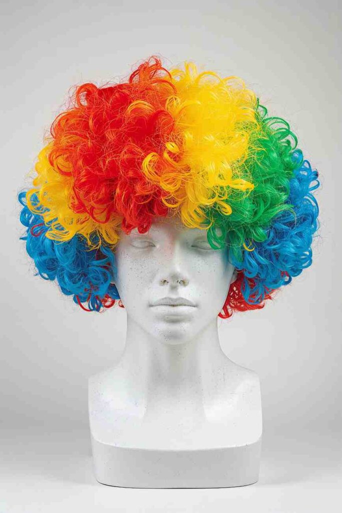 A fluffy rainbow clown wig is perfect for playful or spooky clown costumes.
