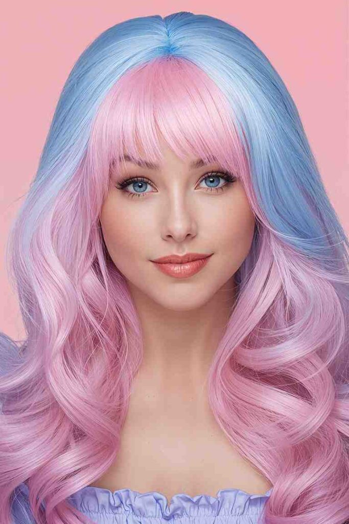 A pastel pink-and-blue wig creates a sweet, dreamy look—great for fairies, candy queens, or fun clown costumes.
