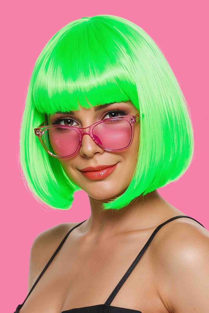 A bright neon bob instantly adds energy to your Halloween look. Whether it’s green, pink, or electric blue, this bold wig is perfect for futuristic or playful costumes.