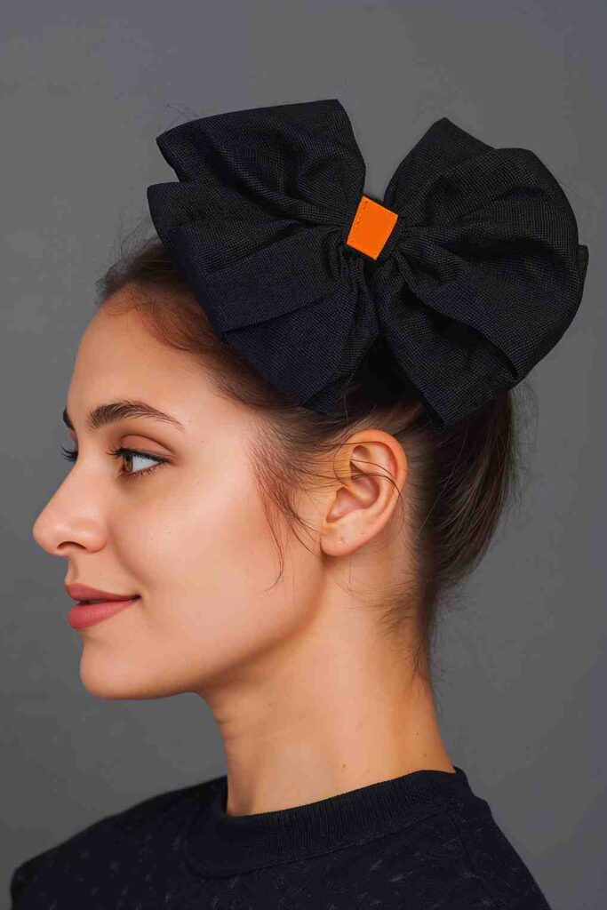 An oversized black or orange bow clip transforms even a basic hairstyle into a Halloween statement.