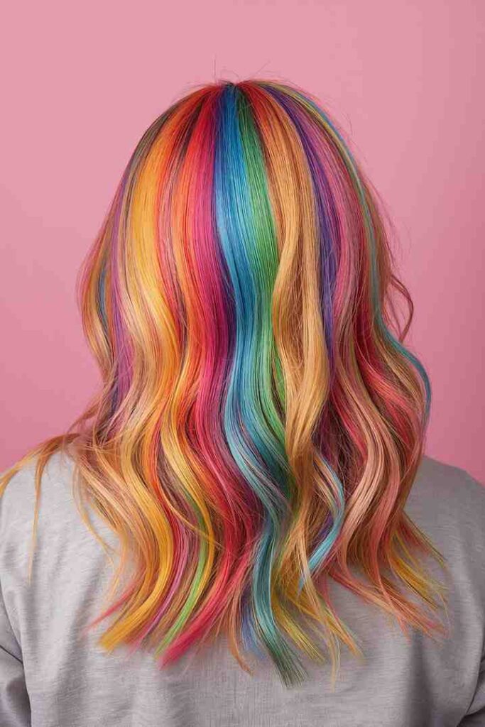 Use temporary rainbow sprays to create vibrant streaks throughout your hair. It’s ideal for unicorns, clowns, or whimsical costumes.