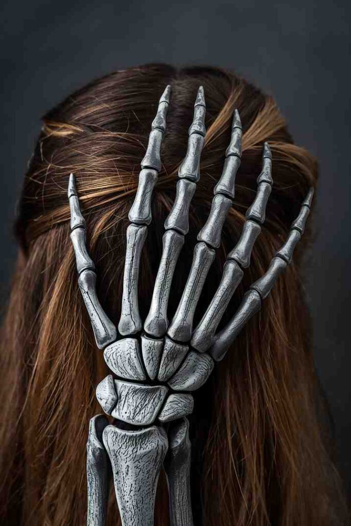 Add skeleton hand clips gripping your hair for a quick Halloween-ready look that works with any hairstyle.