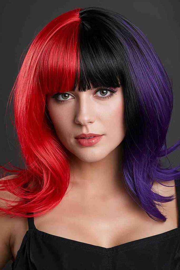 Pick a half-and-half wig in bold colors like black and red or purple and green for a striking Halloween effect.