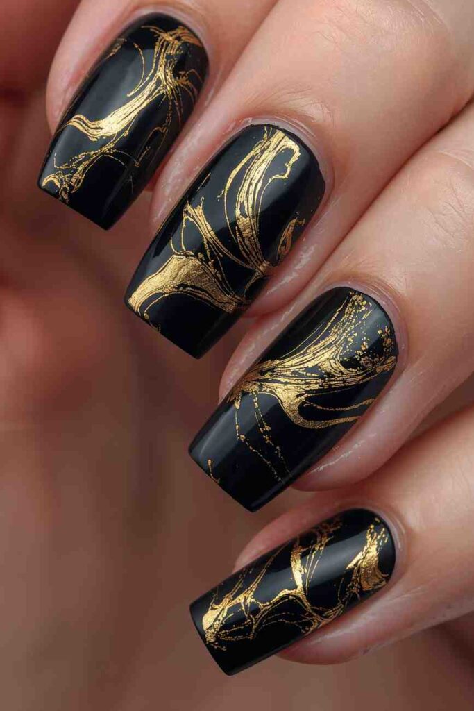 9. Black & Gold Marble Nails