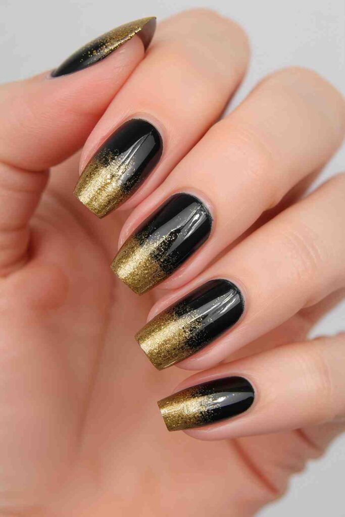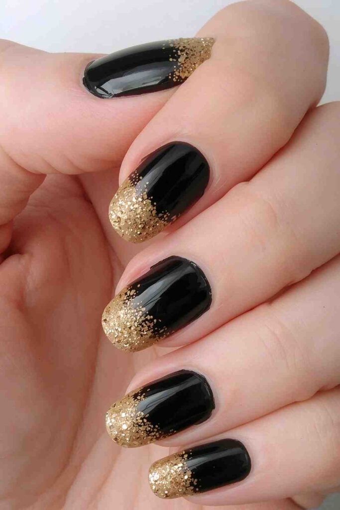 5. Black Nails with Gold Glitter Gradient