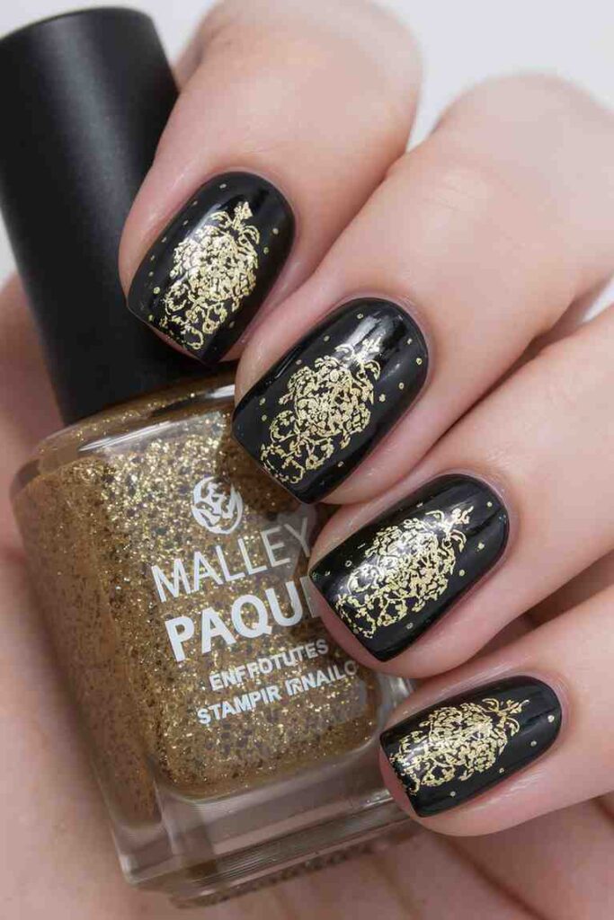 11. Black Nails with Gold Lace Stamping