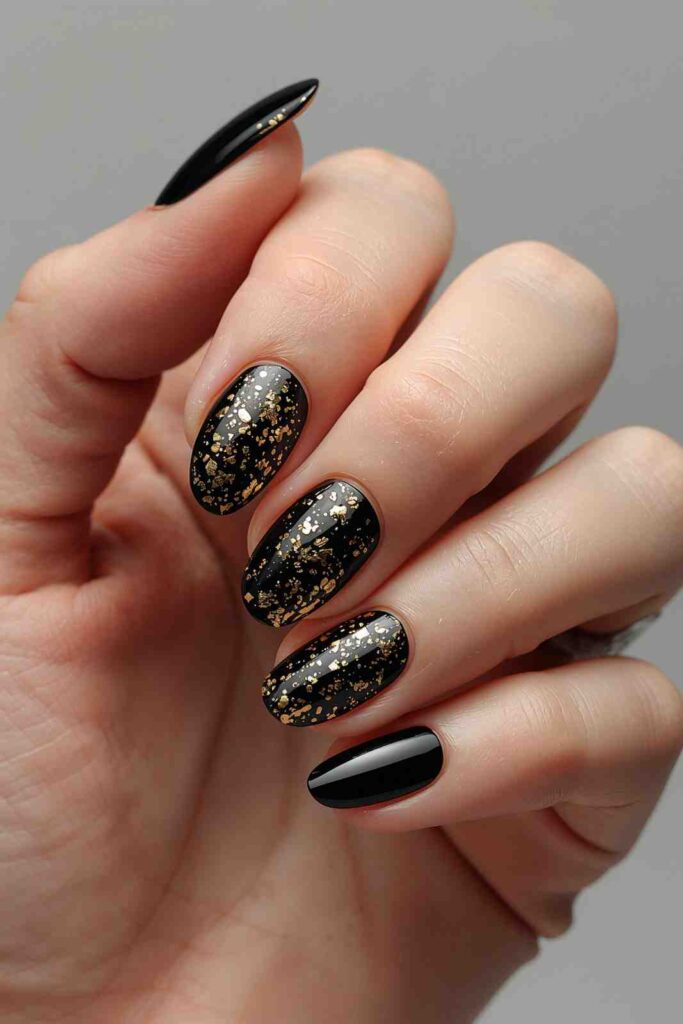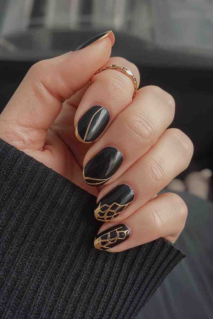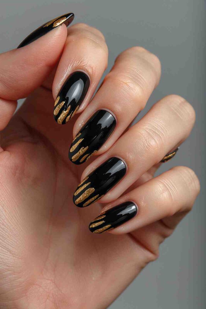 Paint your nails black and add gold drip designs at the cuticles or tips for a “liquid gold” look.