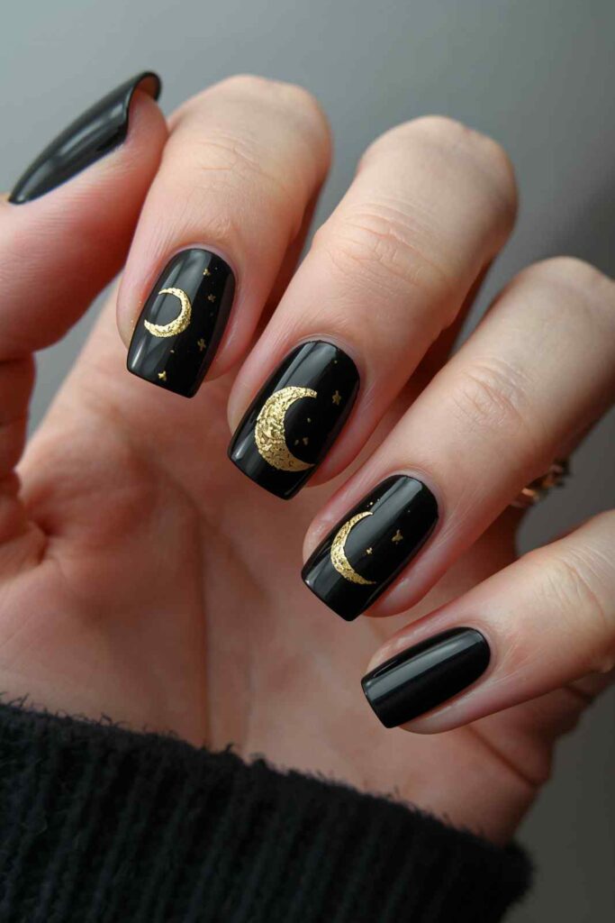 Paint tiny gold crescent moons on black nails for a celestial touch that nods to Halloween’s mystical side.