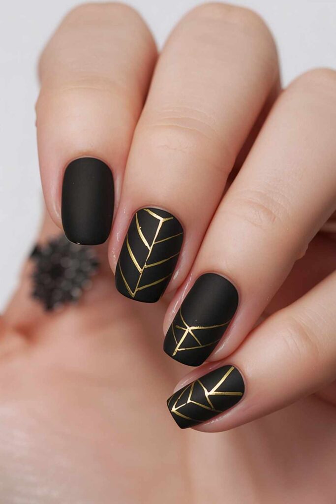 Use thin gold striping tape or a fine brush to create geometric patterns over a matte black base. Triangles, grids, or minimal lines give a modern edge.