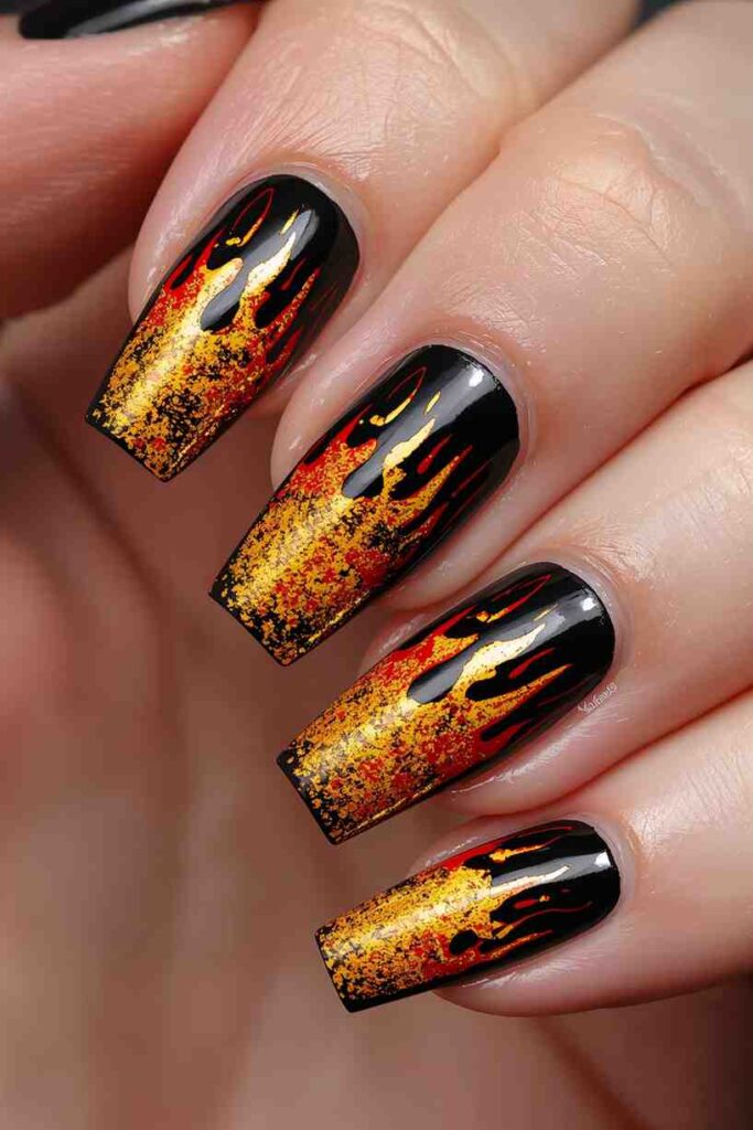 Outline gold flame shapes over black nails for a fiery, bold, and edgy look. This design brings instant drama to your fingertips.