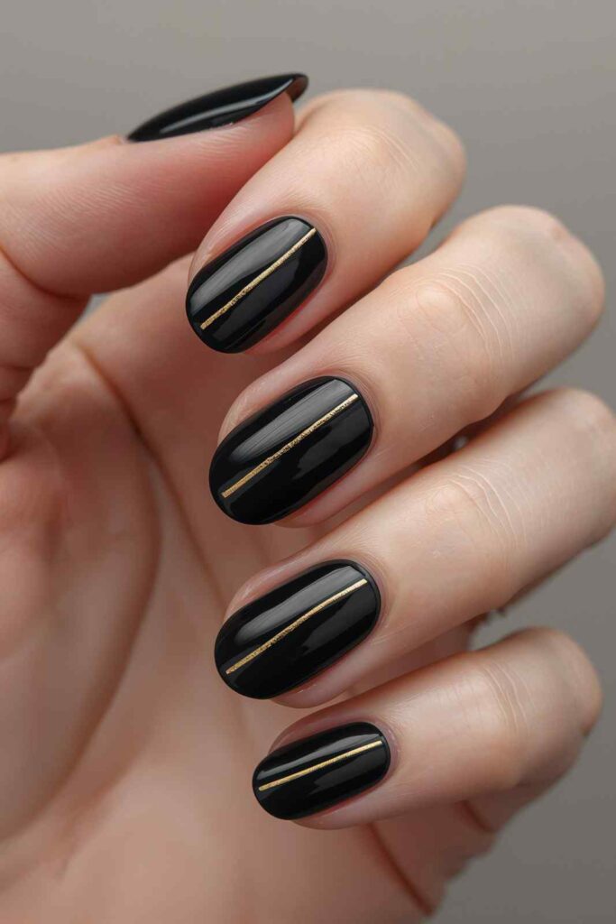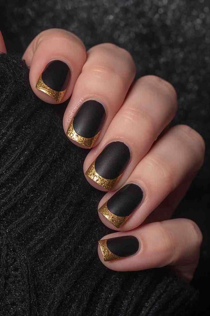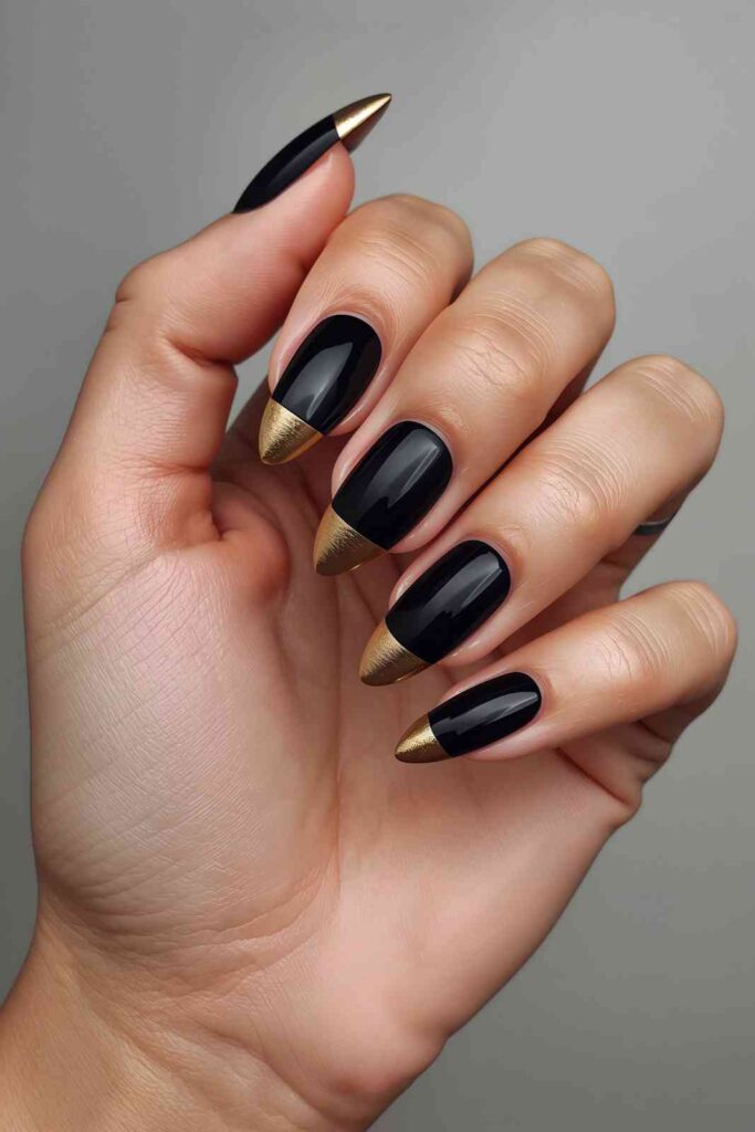 Give the traditional black manicure a refined twist by adding gold tips. Whether you choose thin metallic lines or bold gold French tips, the contrast is striking and sophisticated.