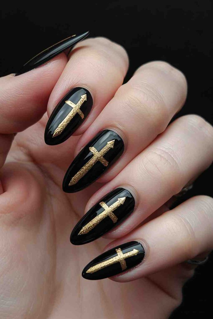 Paint gold cross designs over black nails for a dramatic, gothic-inspired look. This works especially well on long almond or coffin-shaped nails.