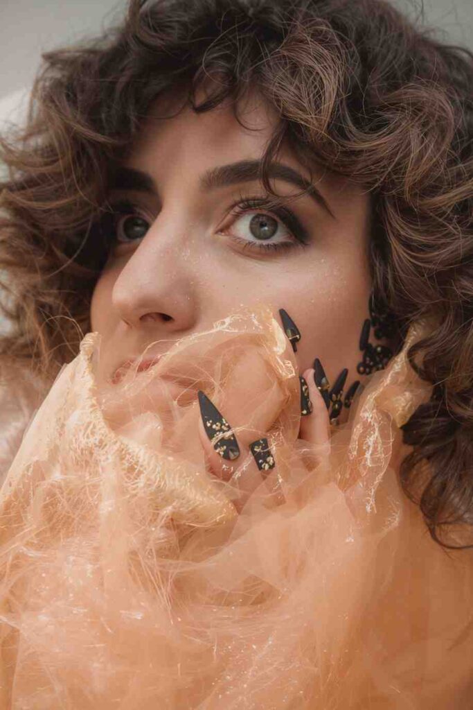 Use stamping plates to imprint intricate gold lace or filigree patterns onto black nails. This look feels delicate and royal.